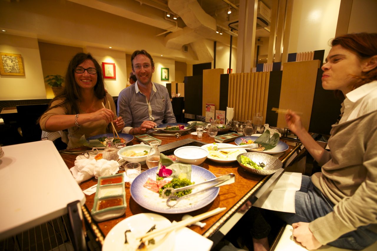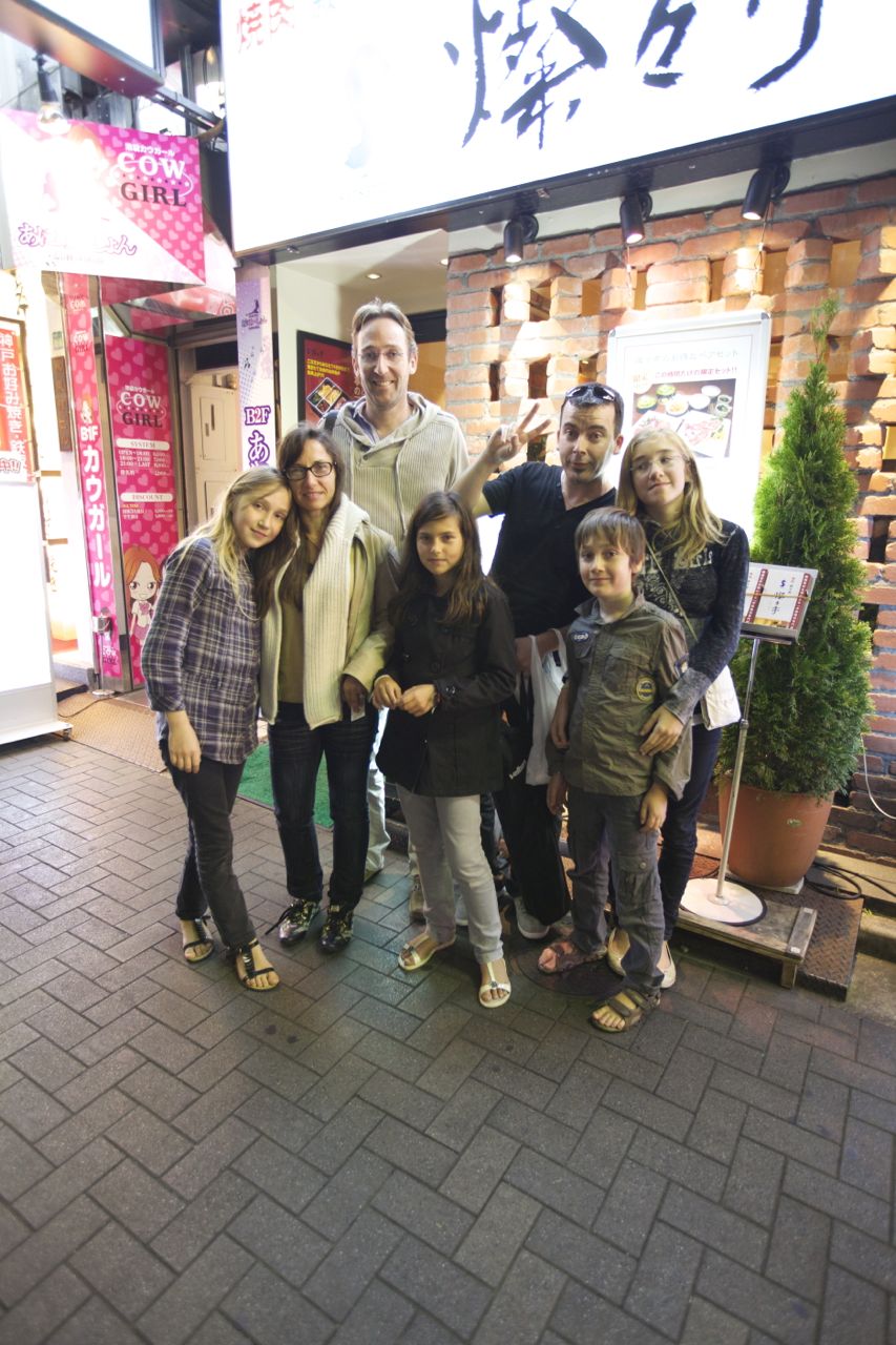 Salut les amis ! Ca fait super plaisir de croiser vos bouilles sur Tokyo et de partager votre “premier” repas “asiatique” dans votre tour du monde ! un Yakiniku : boeuf fantastiquement fondant grillé accompagné de riz et de légumes. A noter que notre “barbecue” de ce soir était encastré au beau milieu de la table. Les enfants, les ados et les adultes ont joué au chef cuisinier… avec plus ou moins de succès dans la maitrise des baguettes.